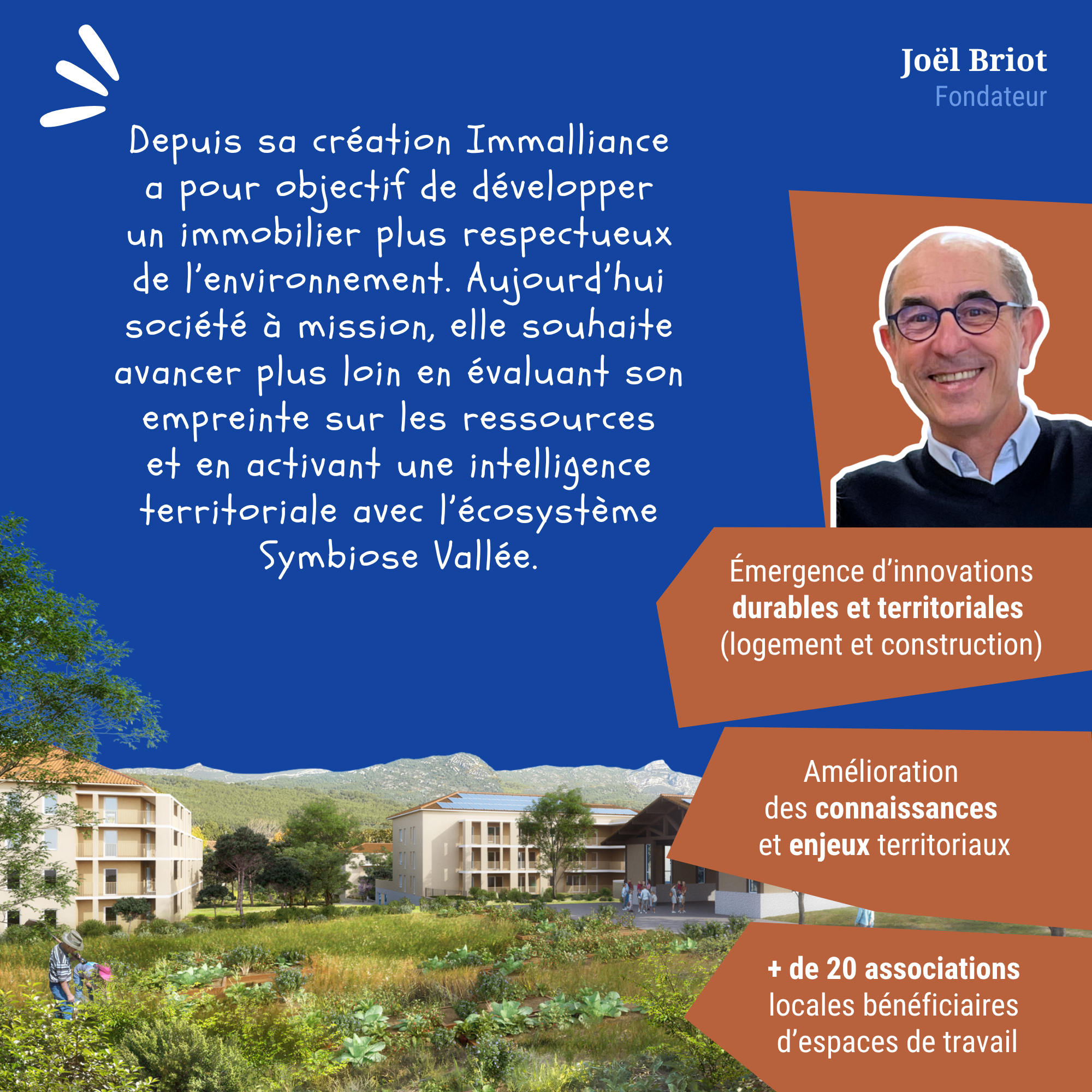 Depuis sa création Immalliance a pour objectif de développer un immobilier plus respectueux de l’environnement. Aujourd’hui société à mission, elle souhaite avancer plus loin en évaluant son empreinte sur les ressources et en activant une intelligence territoriale avec l’écosystème Symbiose Vallée.