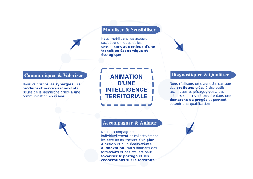 - Animation territoriale : Vous souhaitez mobiliser un réseau d'acteur pour un projet territoriale ! Inspiré des pratiques et des outils d'animation en Intelligence collective, nous vous proposons de vous accompagner grâce à une approche collaborative que nous avons développé. Cette approche permet de relier les acteurs d'un territoire favorisant l’émergence d’une intelligence territoriale et citoyenne.